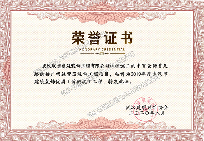 2019年度武漢市建筑裝飾優(yōu)質(zhì)工程黃鶴杯(中百倉儲江夏一店室內(nèi)裝飾工程)